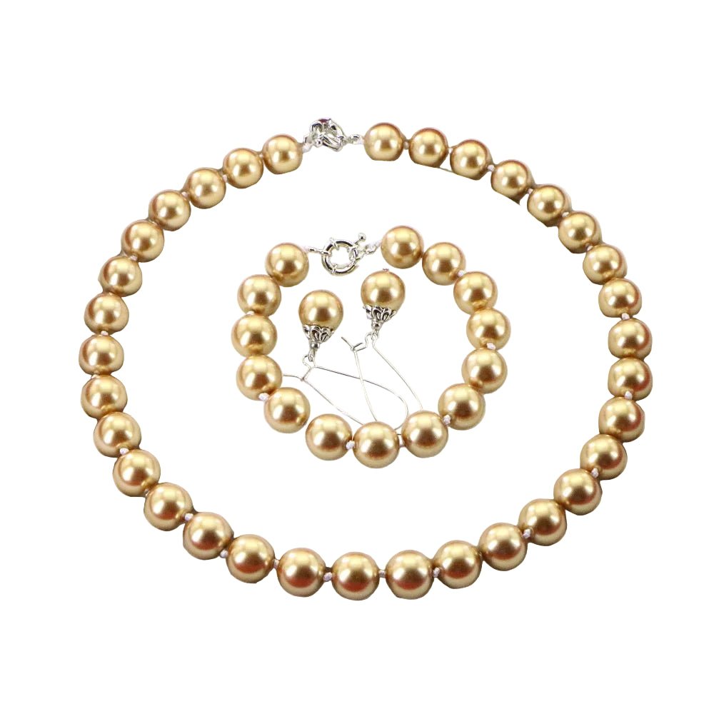 Christmas Jewelry Gift Set – 12mm Gold Round Shell Pearl Necklace, Bracelet & Earrings