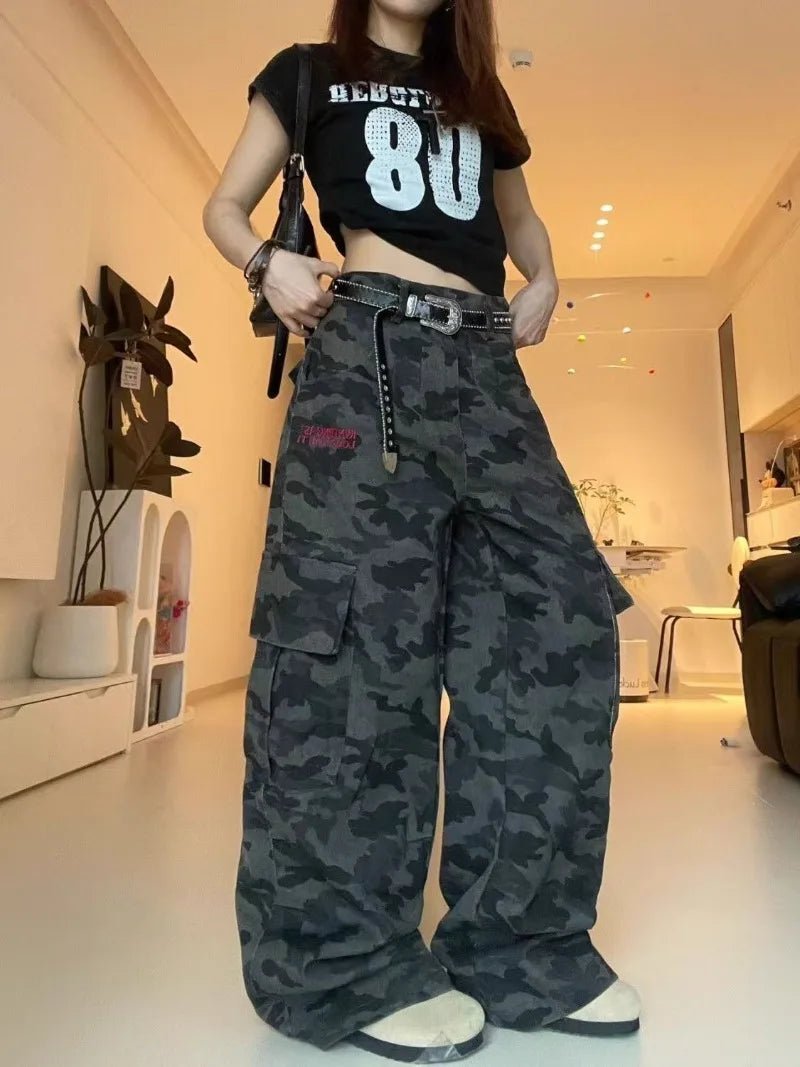 Y2K Retro Embroidered Wide-Leg Jeans for Women – High-Waisted Casual Pants