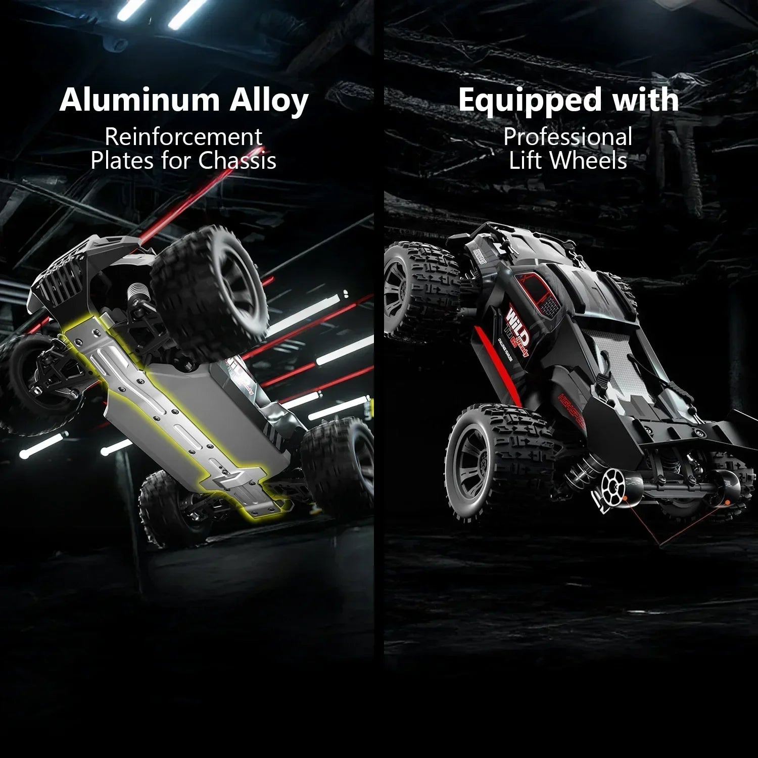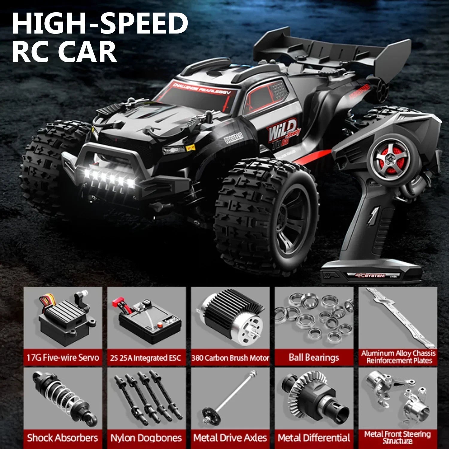 - Durable Build – Reinforced chassis, metal gears, and oil-filled shocks withstand rough terrain.