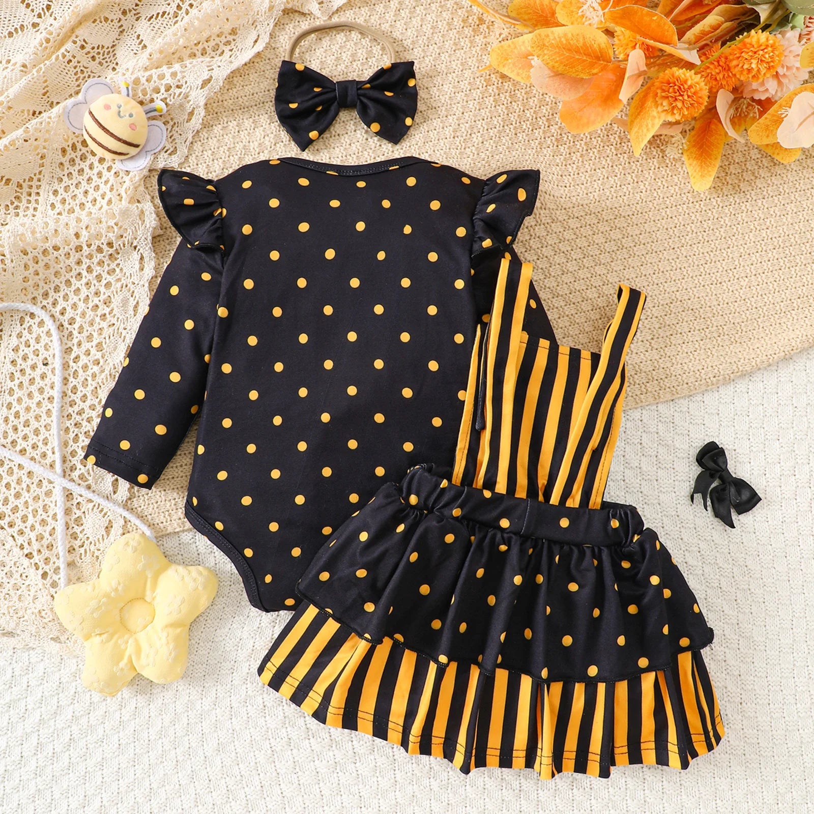 3-piece set: polka dot onesie, striped overall dress, and headband.