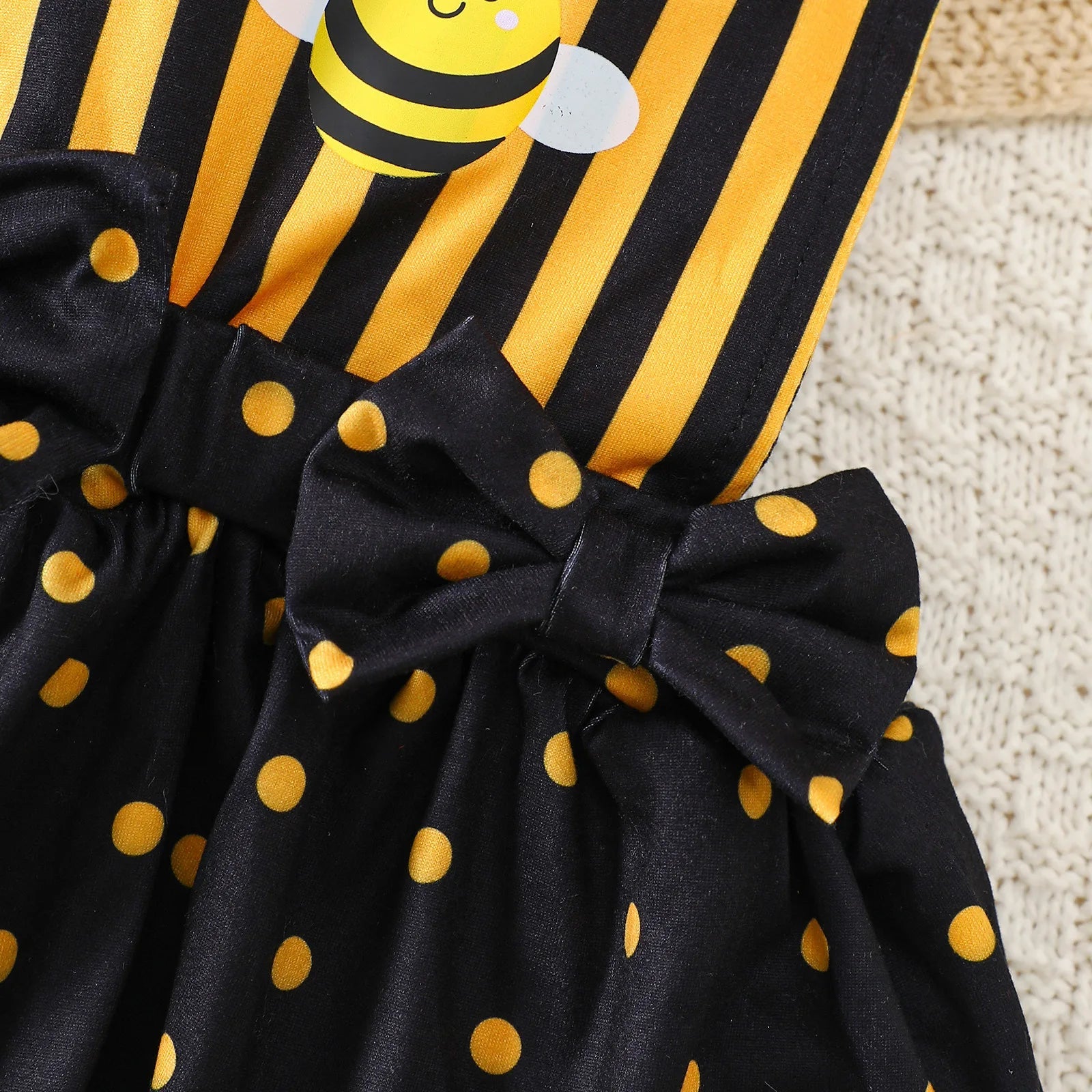 Cute bee and polka dot design adds a playful touch.