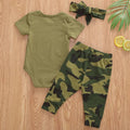 Keep your little one stylish and comfortable with the Baby Summer Camouflage Clothes Set. This adorable 3-piece set includes a short sleeve letter-printed bodysuit top, matching pants, and a hat or headband, perfect for summer outings or daily wear for both boys and girls.