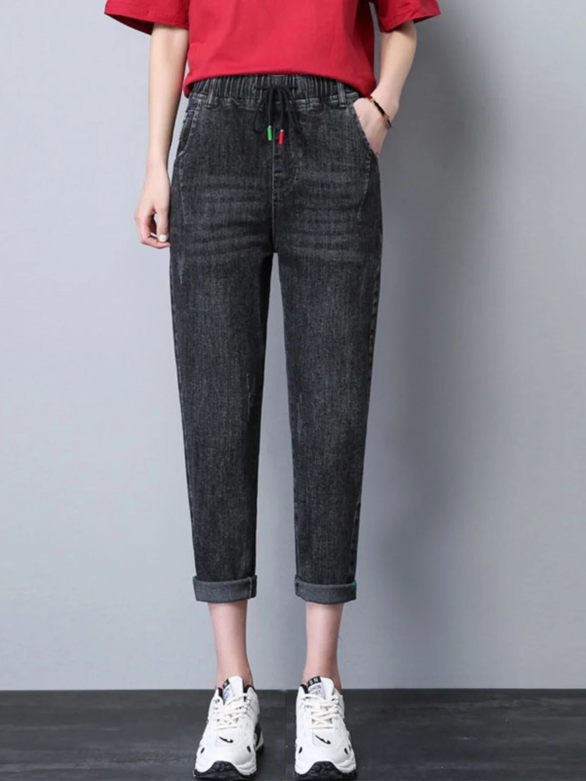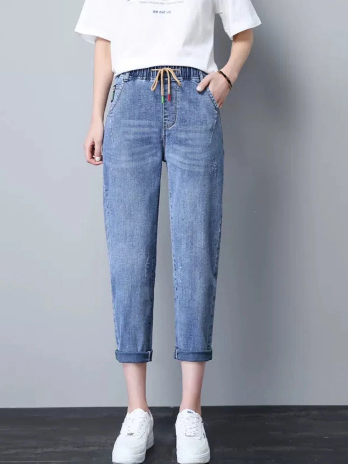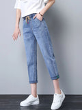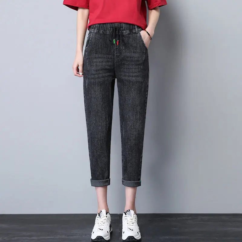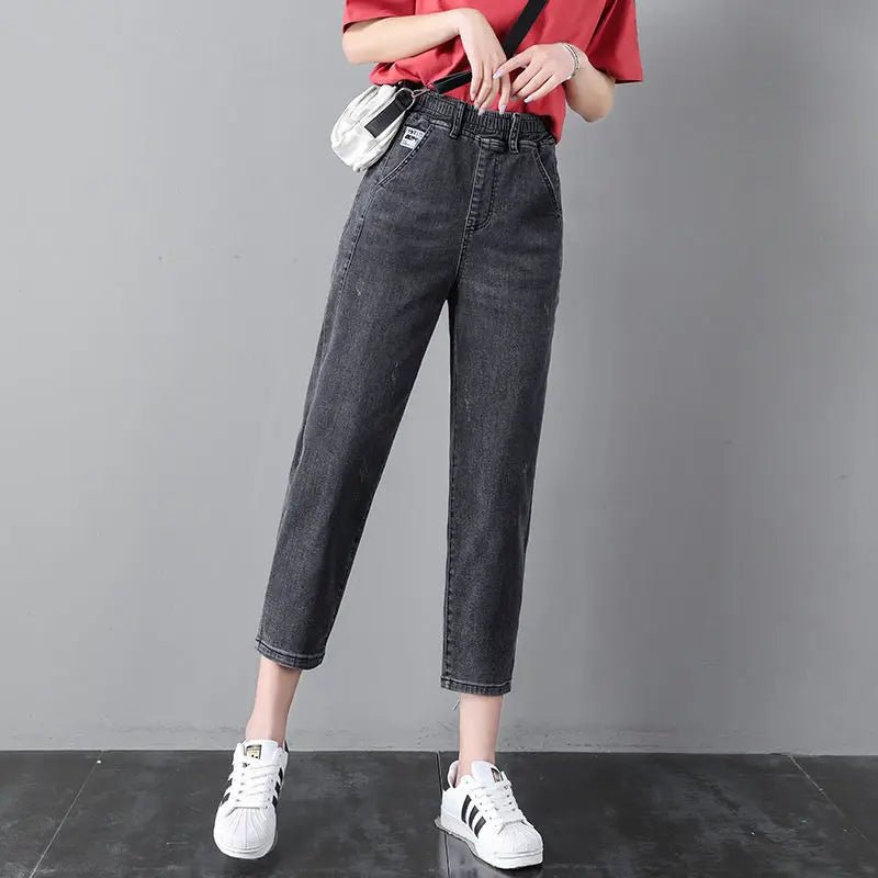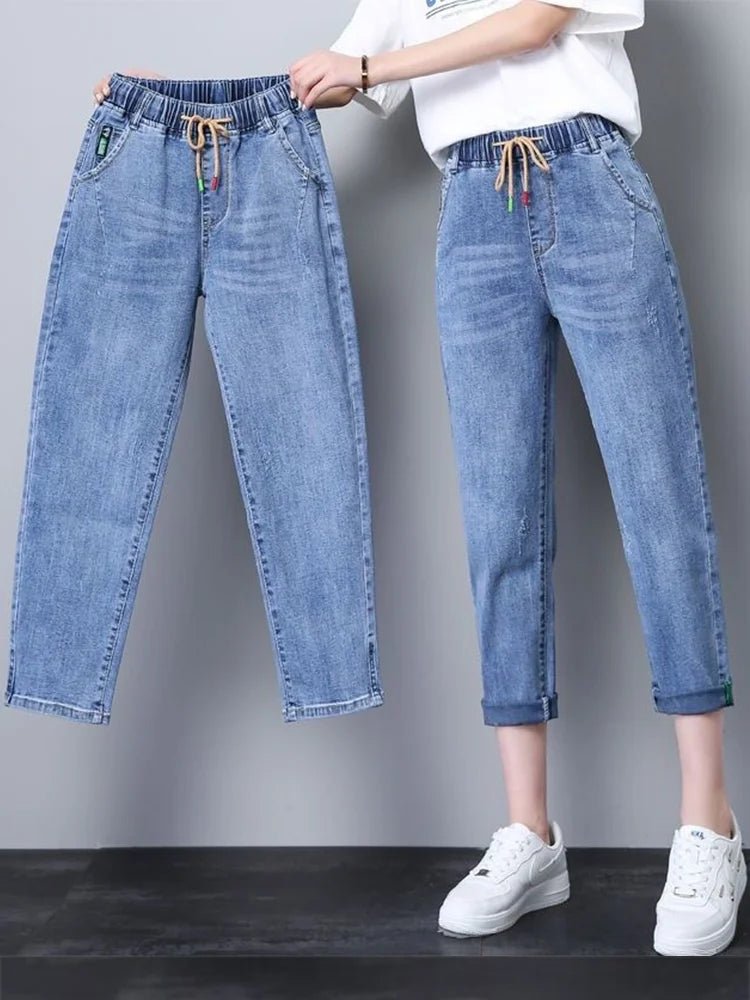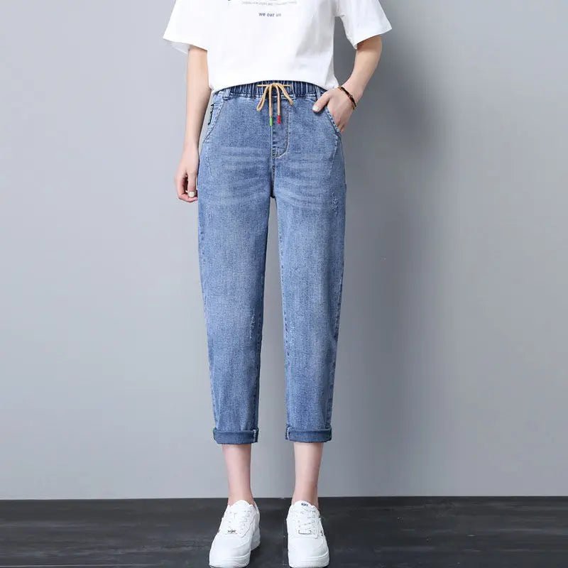 Stay relaxed and stylish with these women’s elastic waist dad jeans, featuring a high-waist fit and a seven-eighth cropped length for a chic, casual look. Made from light blue denim with a soft, breathable finish, these harem-style jeans are perfect for spring, summer, and everyday wear, offering all-day comfort and effortless style.