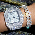 Elevate your style with this luxury moissanite iced out watch, designed for both men and women who appreciate bold, high-end accessories. Crafted from durable stainless steel and adorned with shimmering moissanite stones, this hip hop–inspired bust down watch delivers maximum shine and sophistication. Featuring a precise quartz movement for accurate timekeeping, a secure folding clasp, and a bold Roman numeral dial, it’s the perfect statement piece for parties, anniversaries, birthdays, and special occasions. With 18K gold nano vacuum plating for lasting brilliance, this watch blends premium materials with streetwear luxury for a standout look.