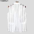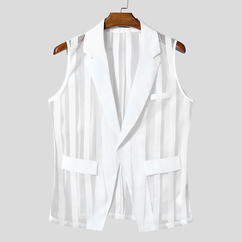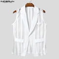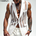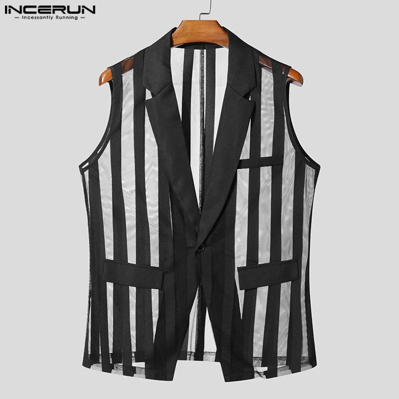 Stay trendy and bold with the Men’s Mesh Striped Sleeveless Waistcoat by INCERUN. Featuring a transparent striped design, one-button closure, and stylish lapel, this streetwear-inspired vest is perfect for casual outings, parties, or fashion-forward layering. Its sleeveless cut offers comfort and freedom of movement while making a strong style statement.