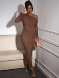 Make a bold entrance with this women’s sparkle one-shoulder maxi dress, featuring a sleek backless design, long fitted sleeves, and a ruched bodycon silhouette for a glamorous, curve-enhancing look. Perfect for club nights, evening parties, and special occasions, this dress adds the right amount of elegance and allure.