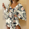 Women’s Floral V-Neck Mini Dress – Lace-Up Batwing Sleeve Beach Cover-Up