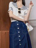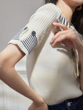 Elevate your casual wardrobe with this women's contrast collar knit polo tee, blending Y2K-inspired charm with modern elegance. Crafted from a soft cotton, polyester, and acetate blend, it offers slight stretch for comfort while maintaining its shape. The black polo neck with a white short-sleeve body creates a striking contrast, perfect for pairing with skirts, trousers, or jeans. Featuring breathable, anti-pilling, and anti-wrinkle properties, this top is ideal for summer wear, whether you're at the office or enjoying a day out. The single-button closure adds a subtle touch of style, making this a versatile piece for any occasion.